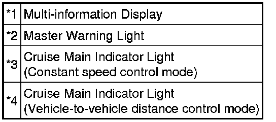 (a) The diagnosis function makes the master warning light and the multi-information display come on, and the cruise main indicator light blinks as shown in the illustration. When a malfunction occurs in the dynamic radar cruise control system, the DTCs are stored in the ECM.