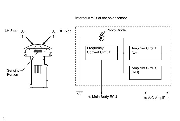 (b) The solar sensor detects (in the form of changes in the current that flows through the built-in photo diode) the changes in the amount of sunlight from the LH and RH sides (2 directions) and outputs these sunlight strength signals to the A/C amplifier.