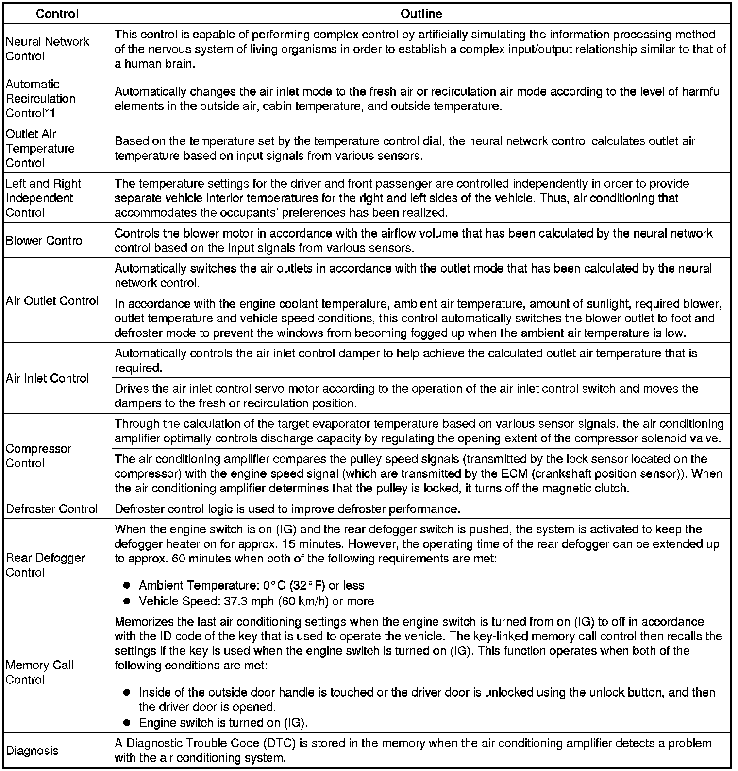 However, because the senses of a person are rather complex, a given temperature is sensed differently, depending on the environment in which the person is situated. For example, a given amount of solar radiation can feel comfortably warm in a cold climate, or extremely uncomfortable in a hot climate. Therefore, as a technique for effecting a higher level of control, a neural network has been adopted in the automatic air conditioning system. With this technique, the data that has been collected under varying environmental conditions is stored in the A/C amplifier. The A/C amplifier can then effect control to provide enhanced air conditioning comfort.