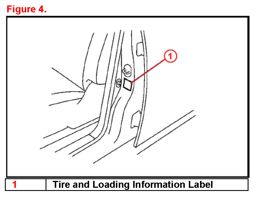 2. Adjust all tires (except the spare tire) to the standard tire inflation pressure, as indicated on the Tire and Loading Information label located inside the driver's door jamb and confirm that the Low Tire Pressure Warning Light is OFF.