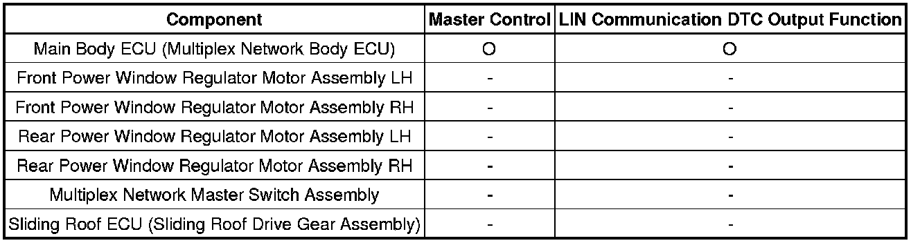 The LIN communication system is used for communication between the components in the tables below. If communication cannot be performed through LIN communication because of an open in the communication lines or other reason, the master control ECU of the relevant system will output a DTC. Refer to the table below about the communication bus lines and connected components.