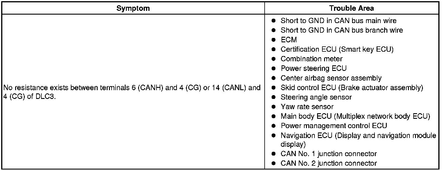 There may be a short circuit between the CAN bus main wire and GND when there is no resistance between terminals 6 (CANH) and 4 (CG) or 14 (CANL) and 4 (CG) of the DLC3.