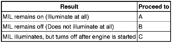 The MIL operation can be checked visually. When the engine switch is first turned on (IG), the MIL should be illuminated and should turn off after engine is started. If the MIL remains illuminated or does not illuminate, conduct the following troubleshooting procedure. If the ECM detects any trouble, the MIL illuminates. At this time, the ECM records a DTC in the memory.