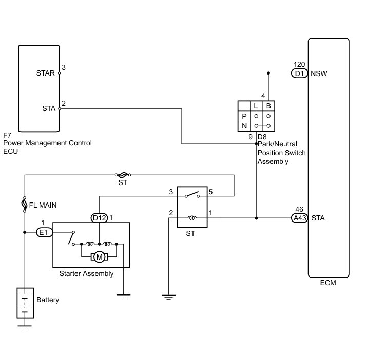 While the engine is being cranked, current flows from terminal STAR of the power management control ECU to the park/neutral position switch and also flows to terminal STA of the ECM (STA signal).