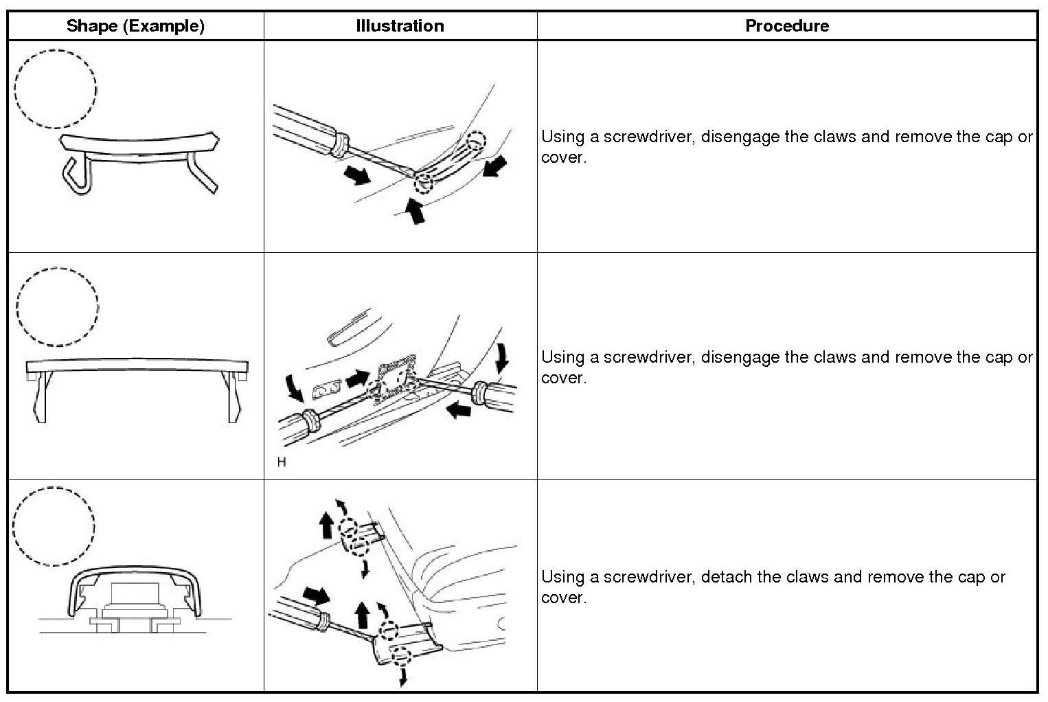 (1) The removal and installation methods of typical claws used for vehicle body parts are shown in the table below.