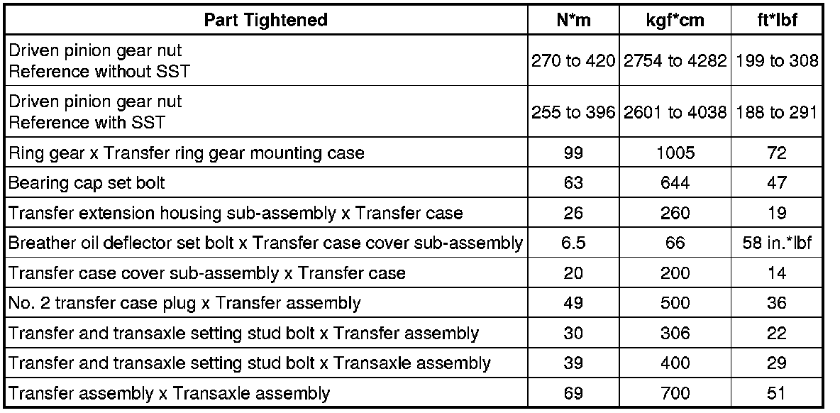 SPECIFICATIONS: MF1A TRANSFER / 4WD / AWD: TORQUE SPECIFICATIONS