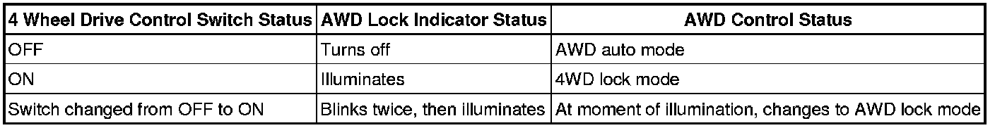 When the engine switch is on (IG) and the 4WD lock switch is turned from OFF to ON, the 4WD lock indicator blinks twice and then illuminates.