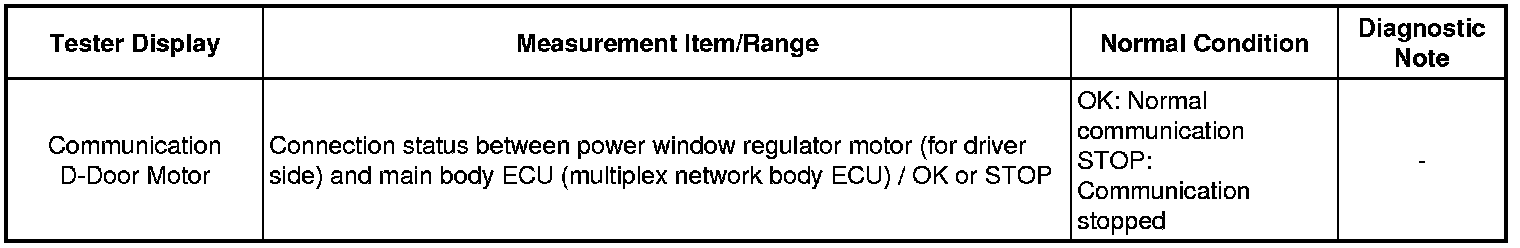 When the engine is running or the engine switch is on (IG), the power window regulator motor assembly (for driver side) is operated by the multiplex network master switch assembly. The power window regulator motor assembly (for driver side) has motor, regulator and ECU functions.