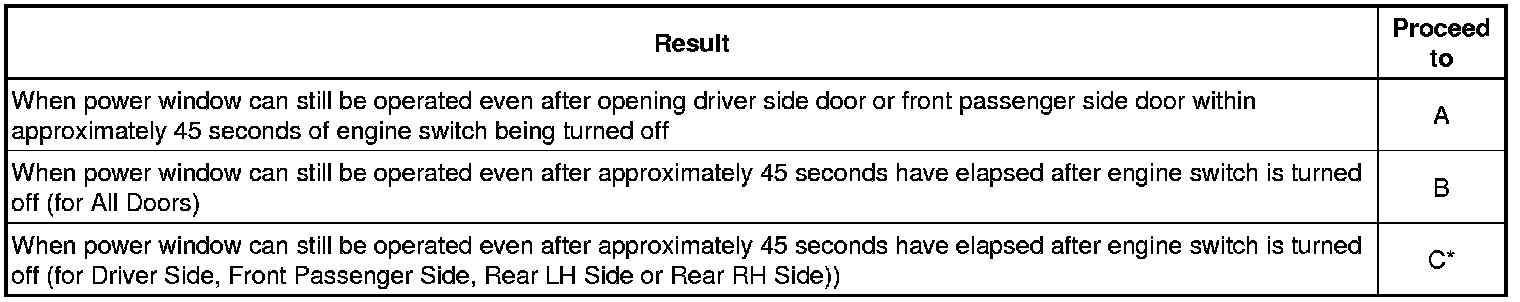*: Replace the power window regulator motor assembly Removalfor Front Door, Removal for Rear Door) for the window that still operates when more than 45 seconds have elapsed after the engine switch was turned off.