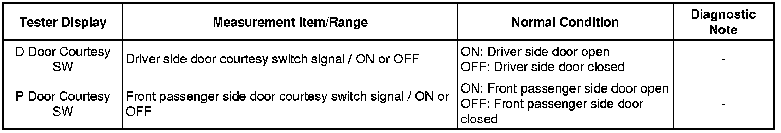 NG -- GO TO LIGHTING SYSTEM (Proceed to Door Courtesy Light Switch Circuit) Door Courtesy Switch Circuit