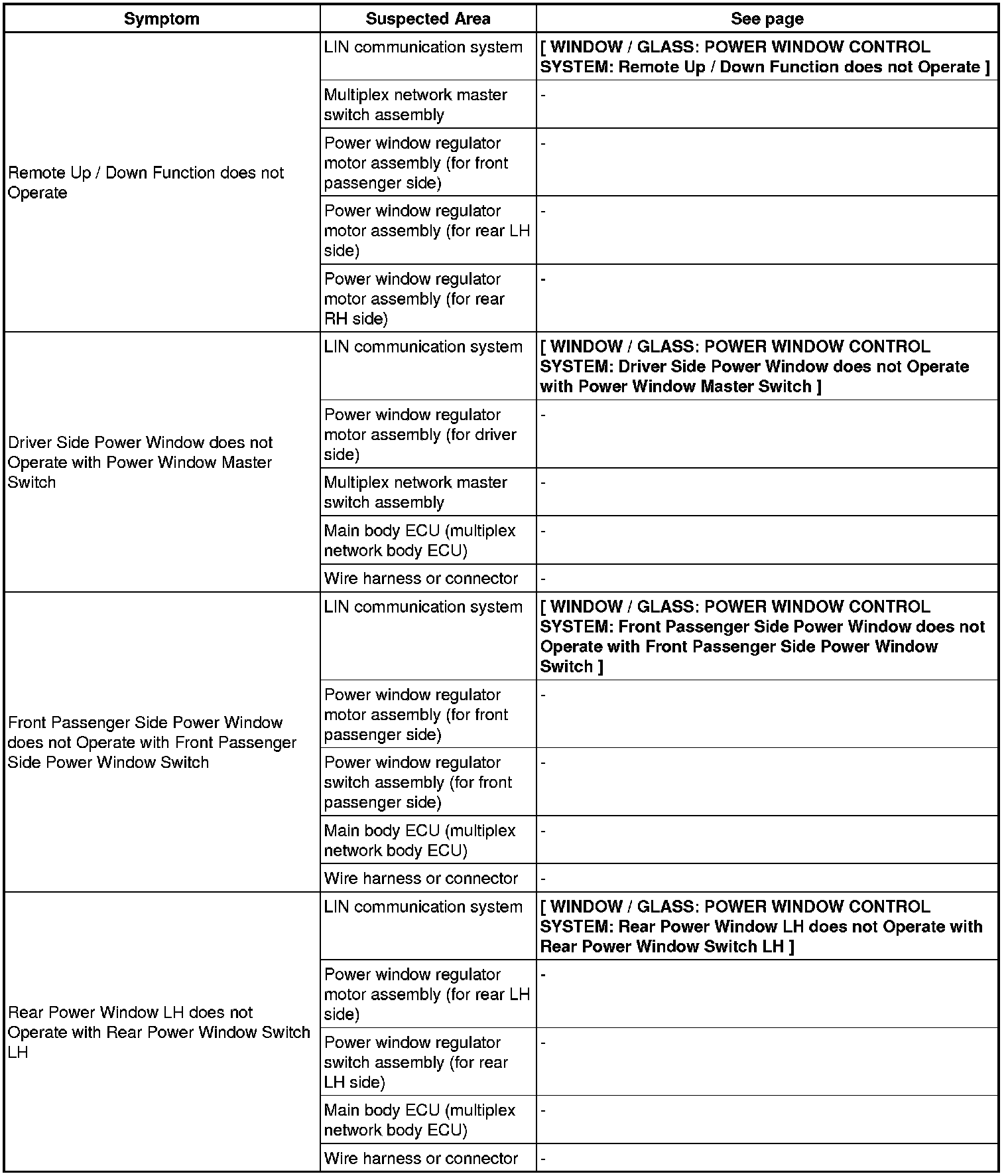 WINDOW / GLASS: POWER WINDOW CONTROL SYSTEM: PROBLEM SYMPTOMS TABLE
