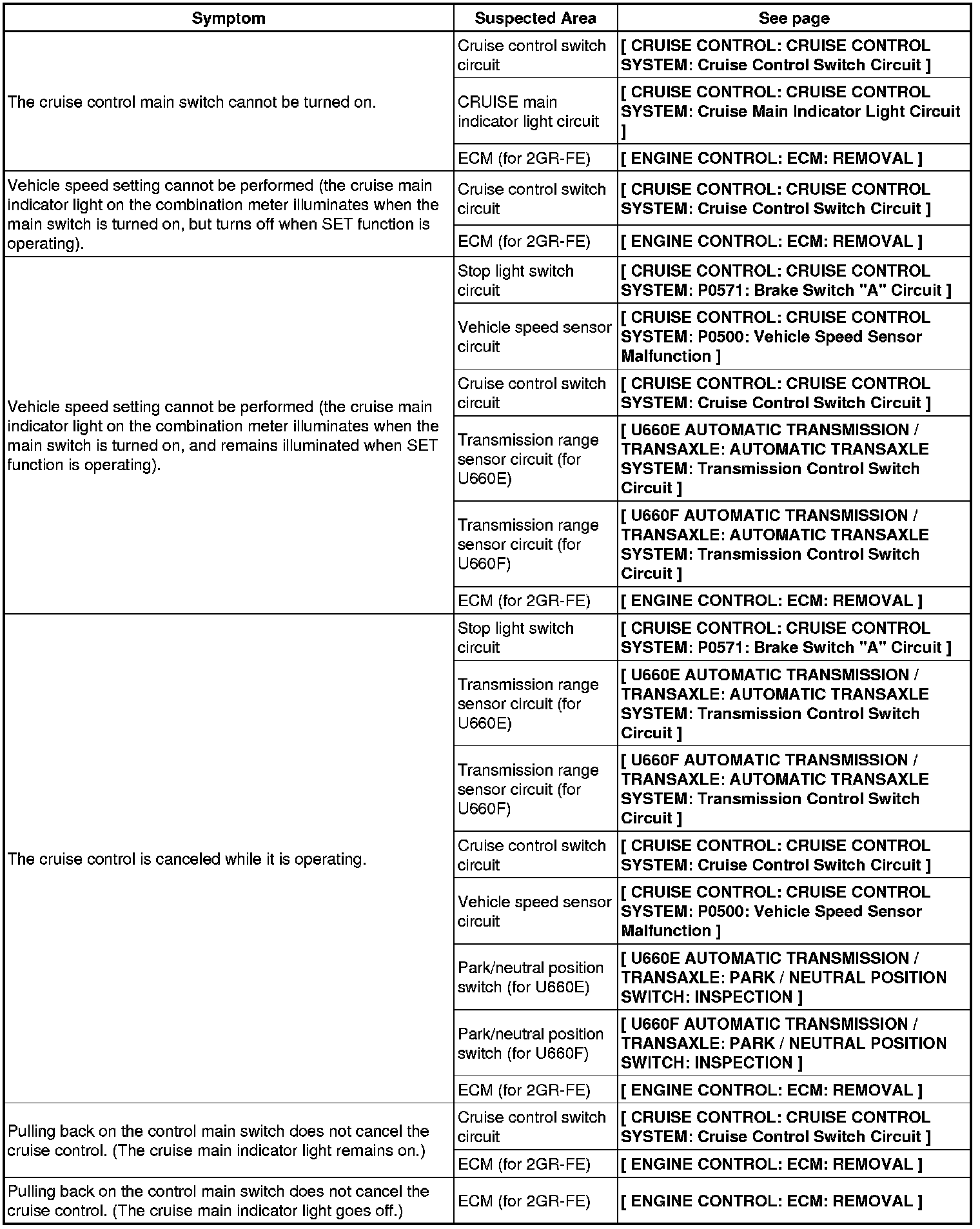 CRUISE CONTROL: CRUISE CONTROL SYSTEM: PROBLEM SYMPTOMS TABLE