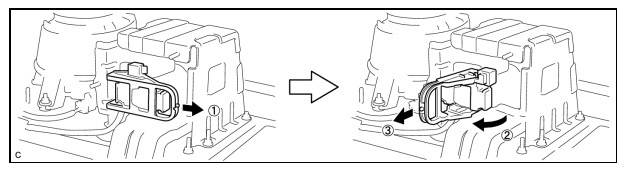 a. Wear insulated gloves and remove the service plug grip after sliding up the lever of the service plug grip as shown in the illustration.