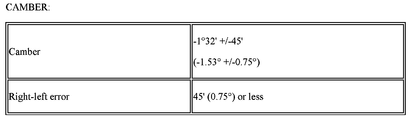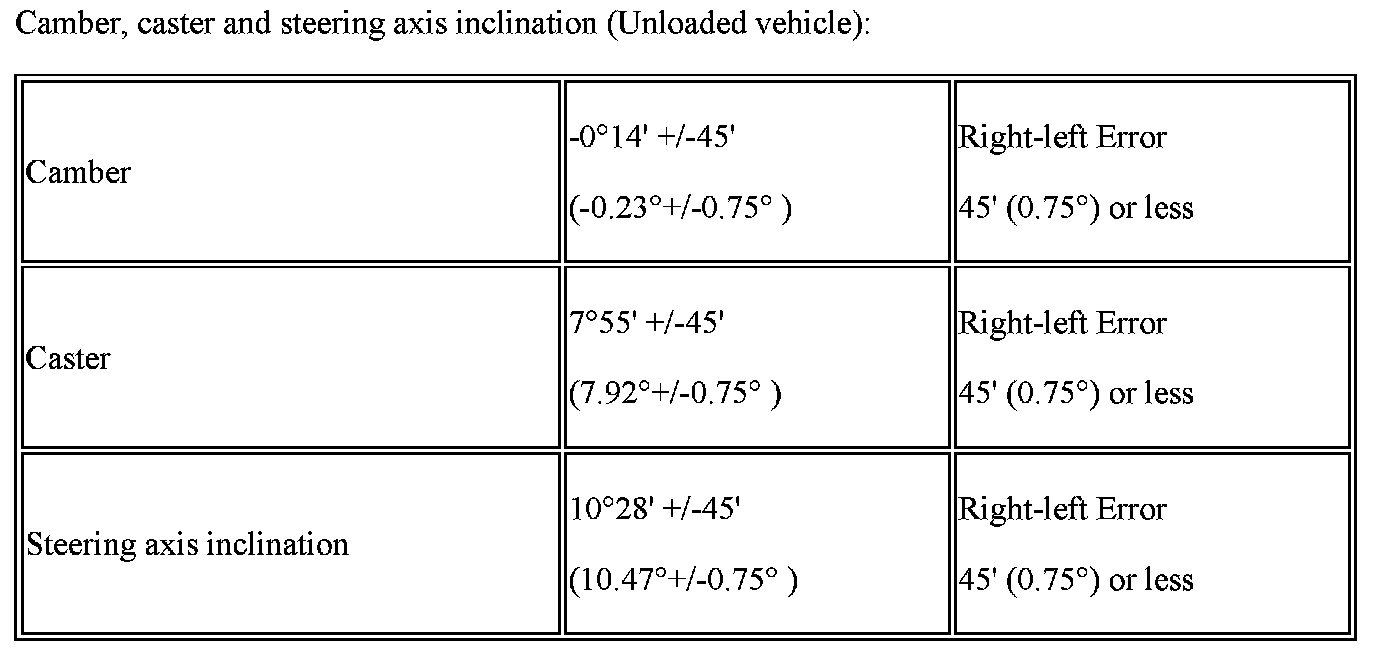 - The maximum tolerance of right and left difference for the camber and caster is 45' (0.75°) or less.