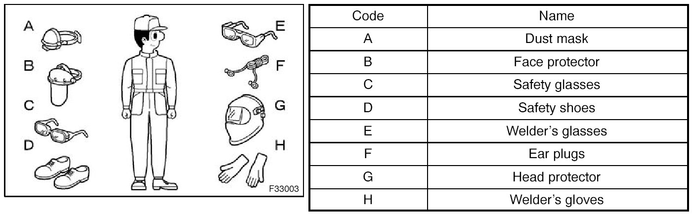 1. In addition to the usual mechanic's wear, cap and safety shoes, the appropriate gloves, head protector, welder's glasses, ear plugs, face protector, dust mask, etc. should be worn as the situation demands.