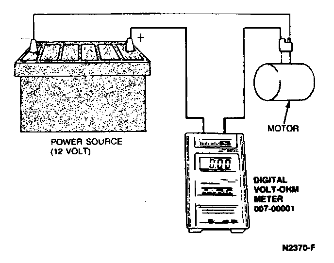 1. Connect an external power source (power-pac or a fully charged battery) to the motor with an ammeter such as Rotunda Digital Volt Ohm Meter 007-00001 or equivalent, in series.