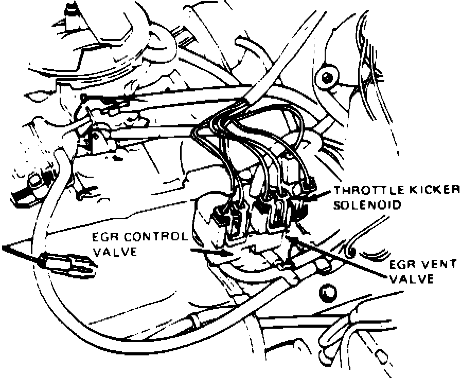 The EGR valve flow rate is controlled by dual EGR control solenoids mounted on a bracket attached to the lefthand valve cover, Fig. 8. Proper control of the vacuum used to operate the EGR valve requires two types of solenoid valves: a vent valve which is normally open, in which the outlet port is normally connected to the inlet port when the solenoid is not operated; a vacuum valve which is normally open, in which the outlet port is normally blocked when the solenoid is not operated.