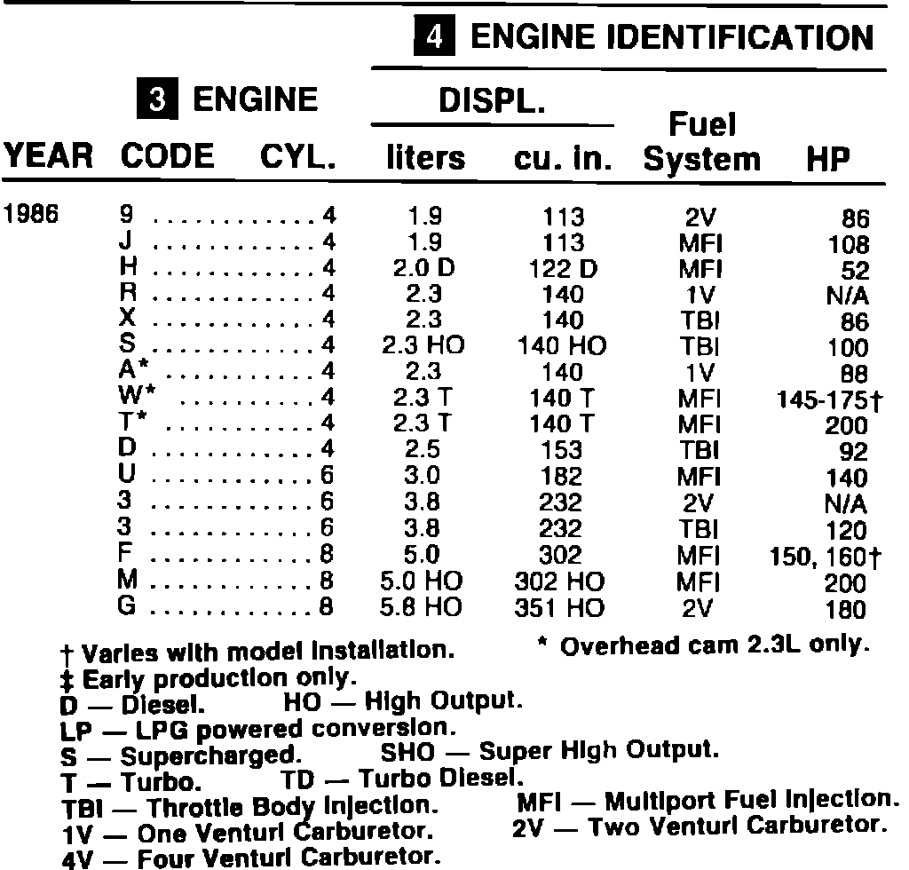 (4) ENGINE IDENTIFICATION: On the line where the engine code appears, read to the right to identify the engine.