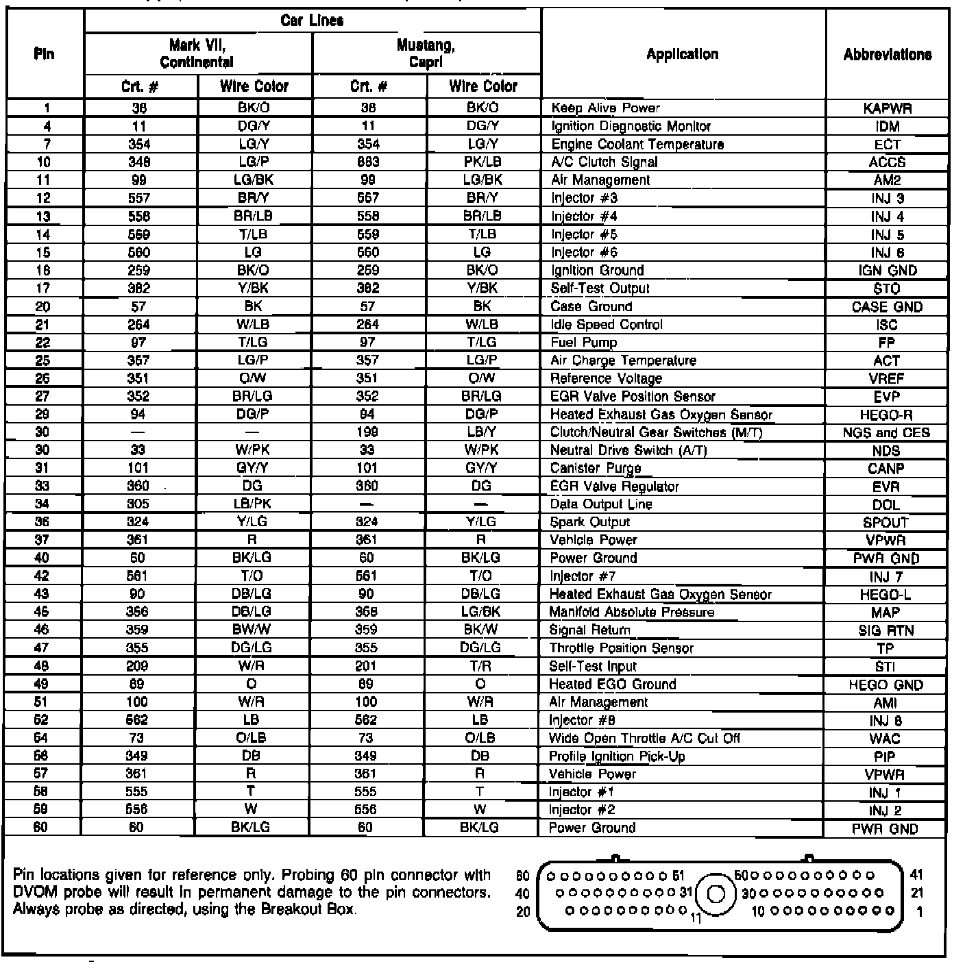Fig. 320 EEC-IV module connector pin usage. 1987 Capri, Lincoln Continental, Mark VII & Mustang w/V8-302 SEFI engine: