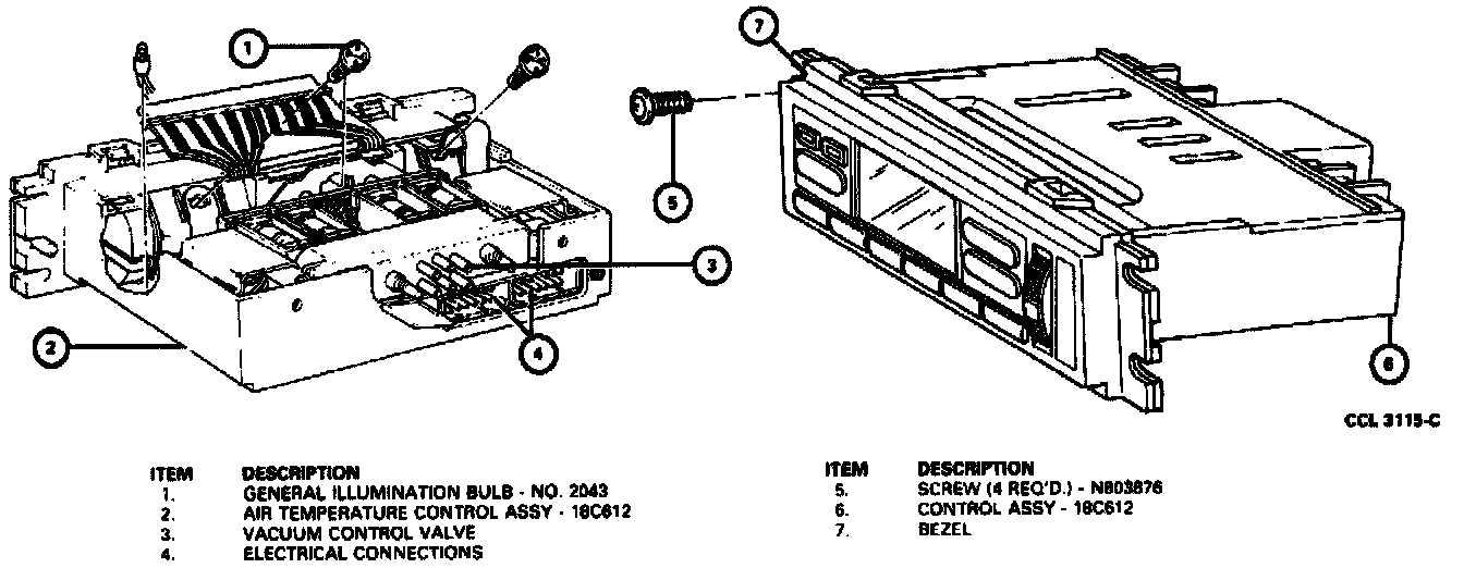 4. Remove four Torx head screws retaining control assembly. Pull control assembly away from instrument panel into a position which provides access to rear connections.