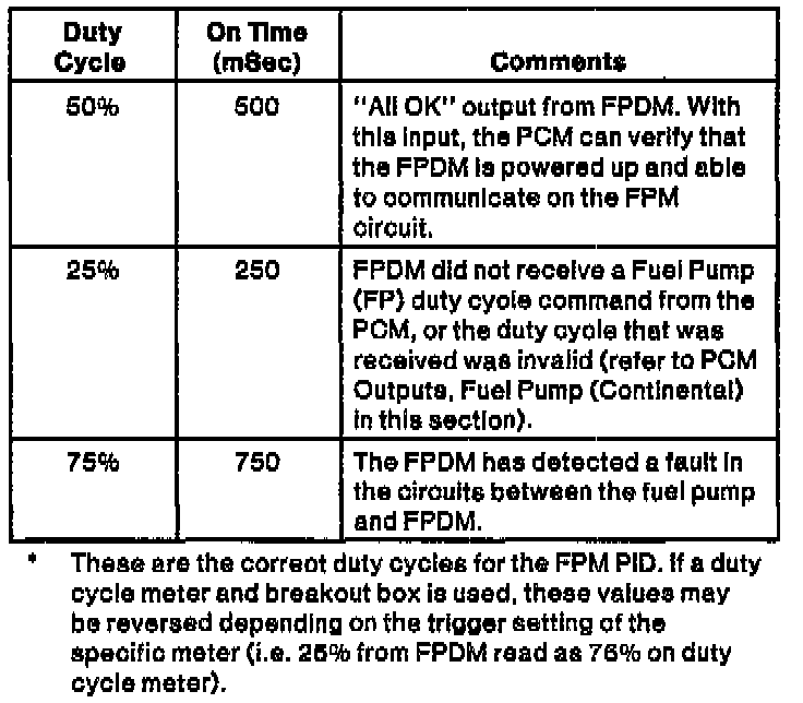 The Fuel Pump Driver Module (FPDM) communicates diagnostic information to the PCM on the FPM circuit. This information is sent by the FPDM as a duty cycle signal. The three duty cycle signals that may be sent are listed in the chart.