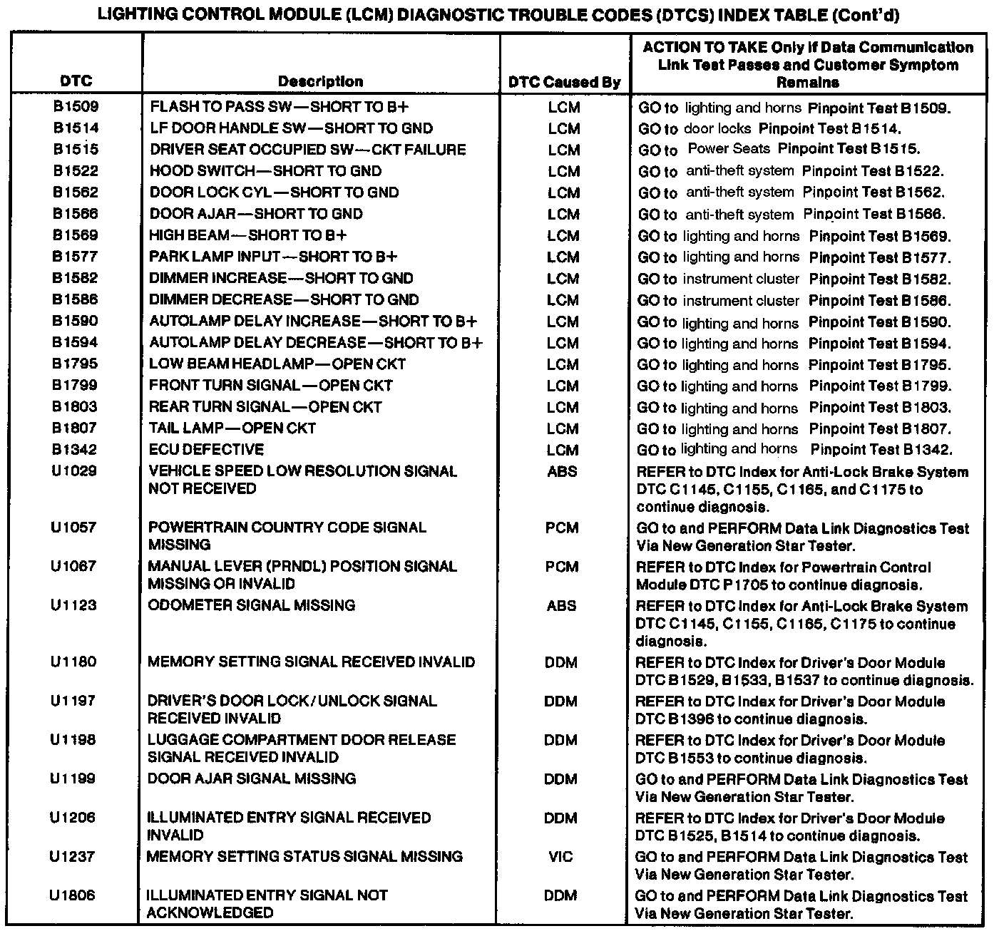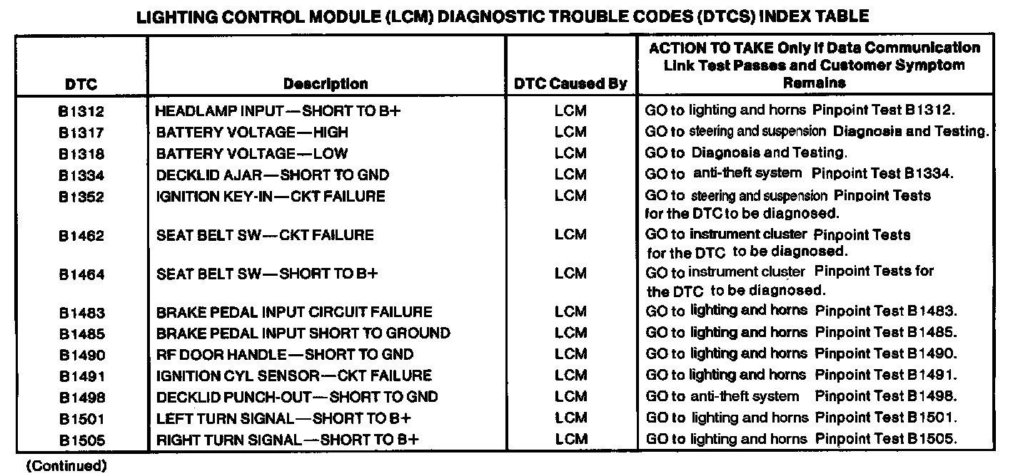 Lighting Control Module Diagnostic Trouble Code Index