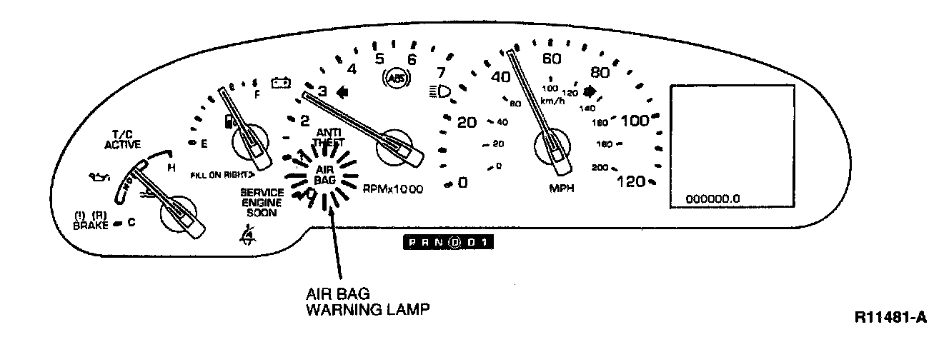 RETRIEVING LAMP FLASH CODES- The air bag diagnostic monitor illuminates the AIR BAG indicator for approximately 6 seconds when the ignition switch is turned to RUN and then turns the air bag indicator OFF. This indicates that the AIR BAG indicator is operational. If the AIR BAG indicator does not illuminate at all, stays on continuously, or flashes at any time, then a fault has been detected by the air bag diagnostic monitor.