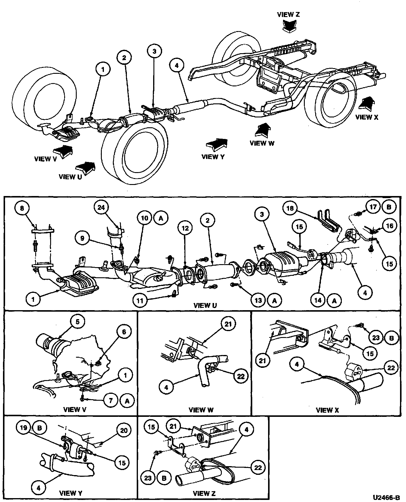 WARNING: The normal operating temperature of the exhaust system is very high. Never attempt to service any part of the system until it has cooled. Be especially careful when working around the catalytic converter. The temperature of the converter rises to a high level after only a few minutes of engine operation.CAUTION: When servicing exhaust system or removing exhaust components, disconnect all heated oxygen sensors at the wiring connectors to prevent damage to the heated oxygen sensors and wiring harness.