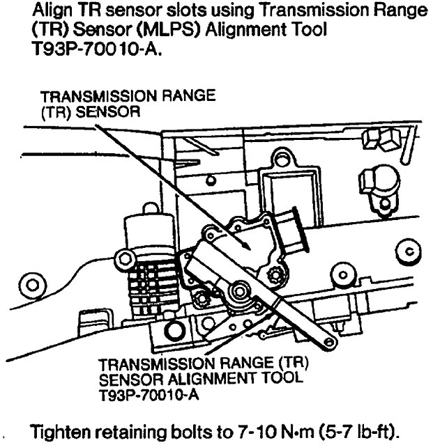 3. Align all three slots on TR sensor with three tabs on tool. slots using TR Sensor Alignment Tool T93P-70010-A or AH.