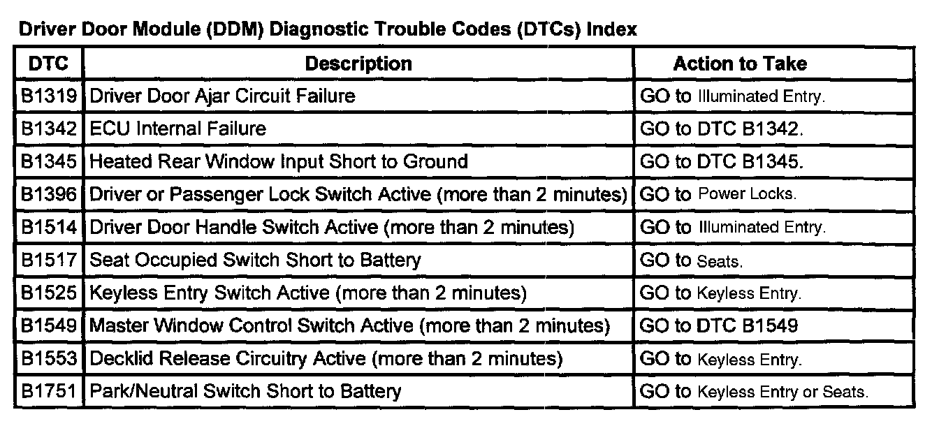 Driver Door Module (DDM) Diagnostic Trouble Code (DTC) Index
