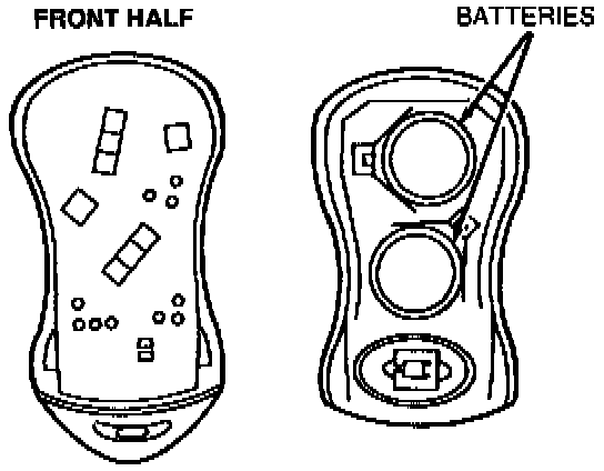 NOTE: The keyless entry remote transmitter is powered by two coin-type, three-volt lithium batteries.