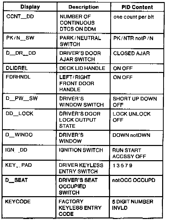 Driver Door Module (DDM) Parameter Identification (PID) Index
