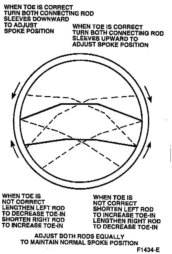 2. Adjust toe. If the steering wheel spokes are in their normal position, lengthen or shorten both rods equally to obtain correct toe. If the steering wheel spokes are not in their normal position, make the necessary rod adjustments to obtain correct toe and steering wheel spoke alignment.