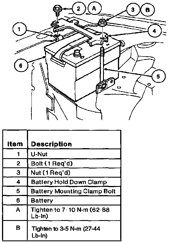 4. Secure cables (positive first) to proper terminals. Tighten battery terminal bolts/nuts to 7-10 Nm (62-88 Lb-In). Do not over-tighten. Apply Premium Long Life Grease XG-1-C or XG-1-K or equivalent meeting Ford specification ESA-M1C75-B to terminals.