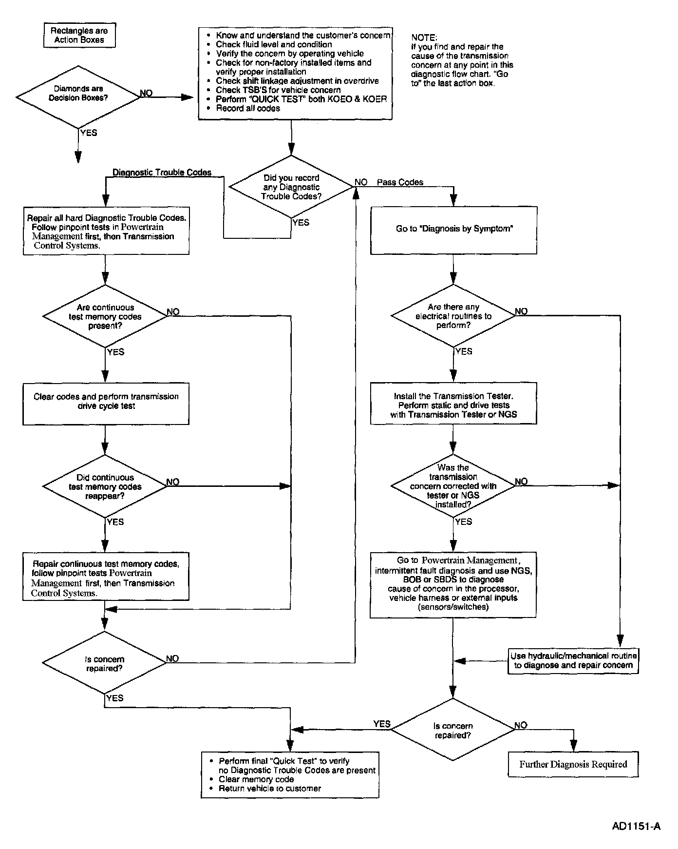 NOTE: Do not take short cuts or assume that critical checks or adjustments have already been made.Troubleshooting an electronically controlled automatic transmission is simplified by using the proven method of diagnosis. One of the most important things to remember is that there is a definite procedure to follow.