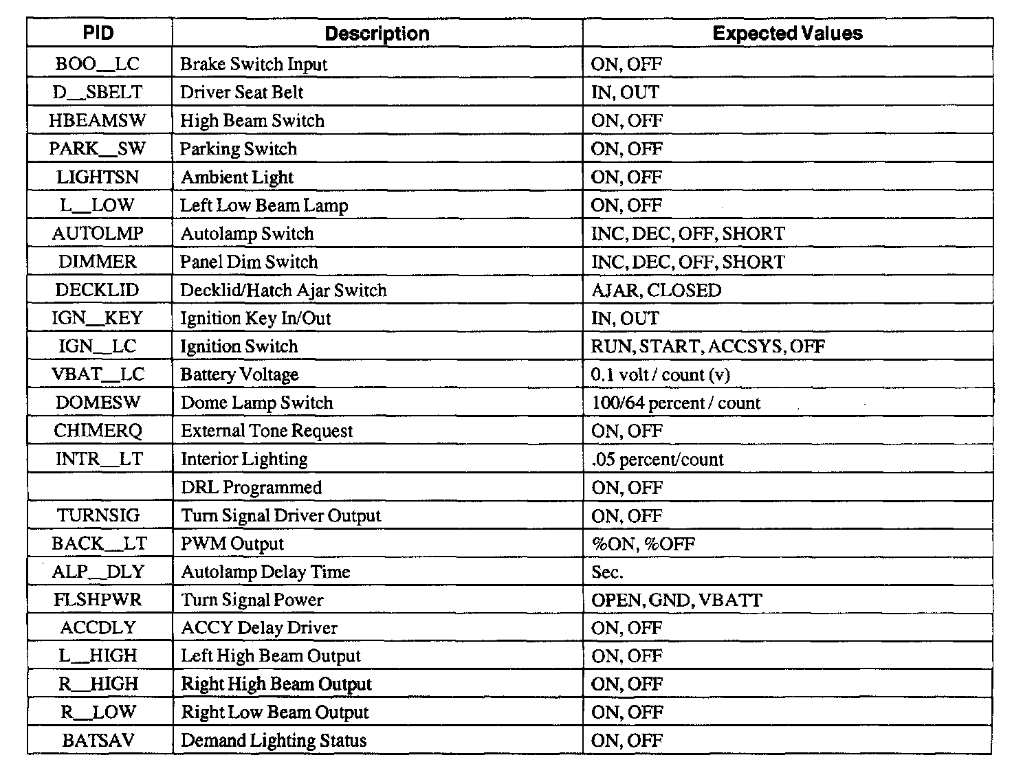 Lighting Control Module Parameter Identification (PID) Index