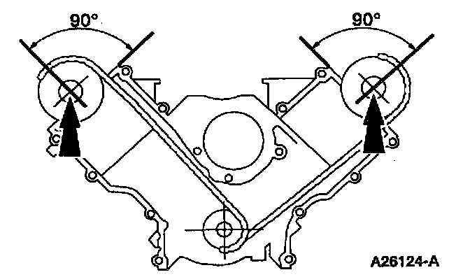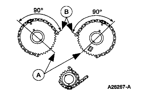 9. Make sure that the (A) camshaft sprocket keyway is 90 degrees from the (B) valve cover mounting surface.