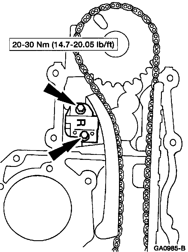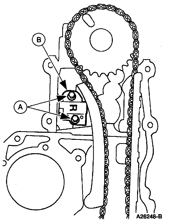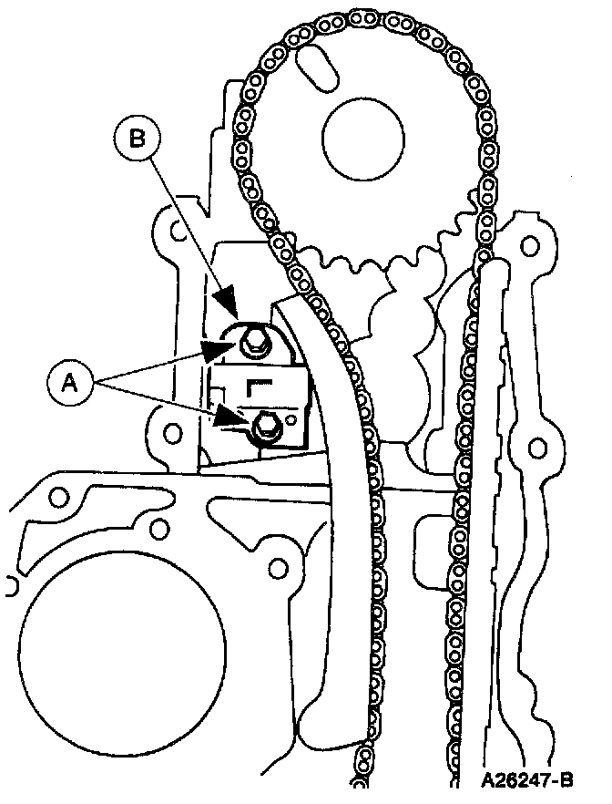 6. Remove the (A) bolts and the (B) RH timing chain tensioner.