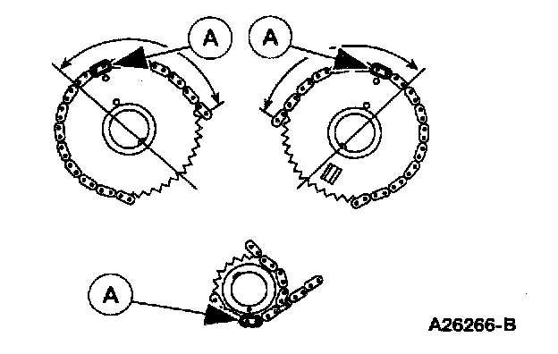 8. Make sure that the (A) copper marks on the timing chain/belt are lined up with the corresponding dots on the crankshaft sprockets and the camshaft sprockets.