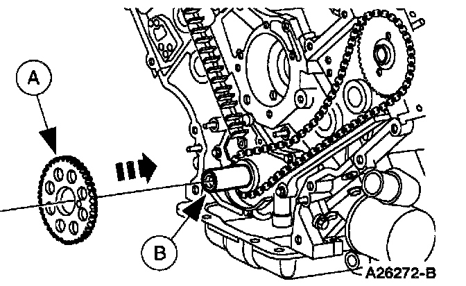 1 Slide the (A) crankshaft main bearing thrust washer onto the (B) crankshaft, aligning the copper link on the timing chain/belt with the dot on the crankshaft main bearing thrust washer.