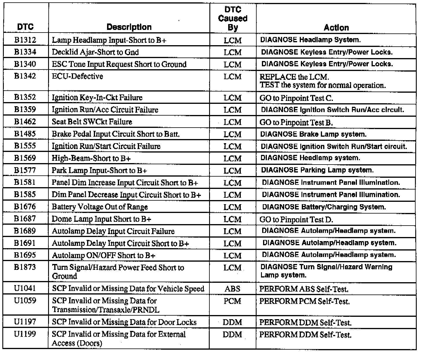 Lighting Control Module Diagnostic Trouble Code Index