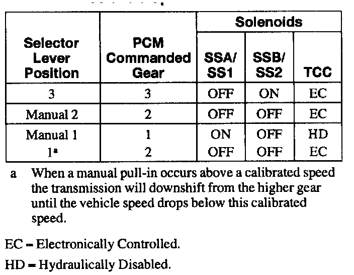 The Transmission Control Switch (TCS) Is A Momentary Contact Switch. When The Switch Is Pressed, A Signal Is Sent To The Powertrain Control Module To Allow Automatic Shifts From First Through Fourth Gears Or First Through Third Gears Only. The PCM Energizes The Transmission Control Indicator Lamp (TCIL) when the switch is off. The TCIL indicates overdrive cancel mode activated (lamp on) and Electronic Pressure Control (EPC) circuit shorted (lamp flashing) or monitored sensor failure.