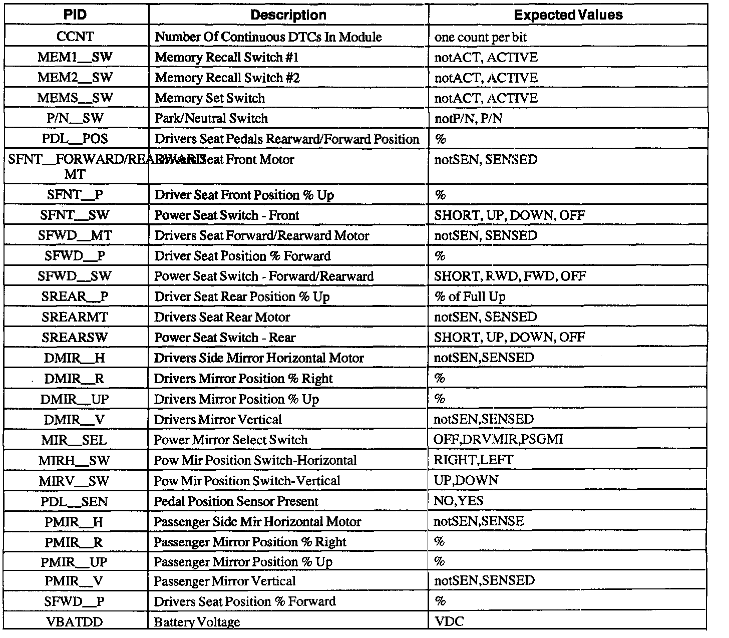 Driver Seat Module (DSM) Parameter Identification (PIDS) Index