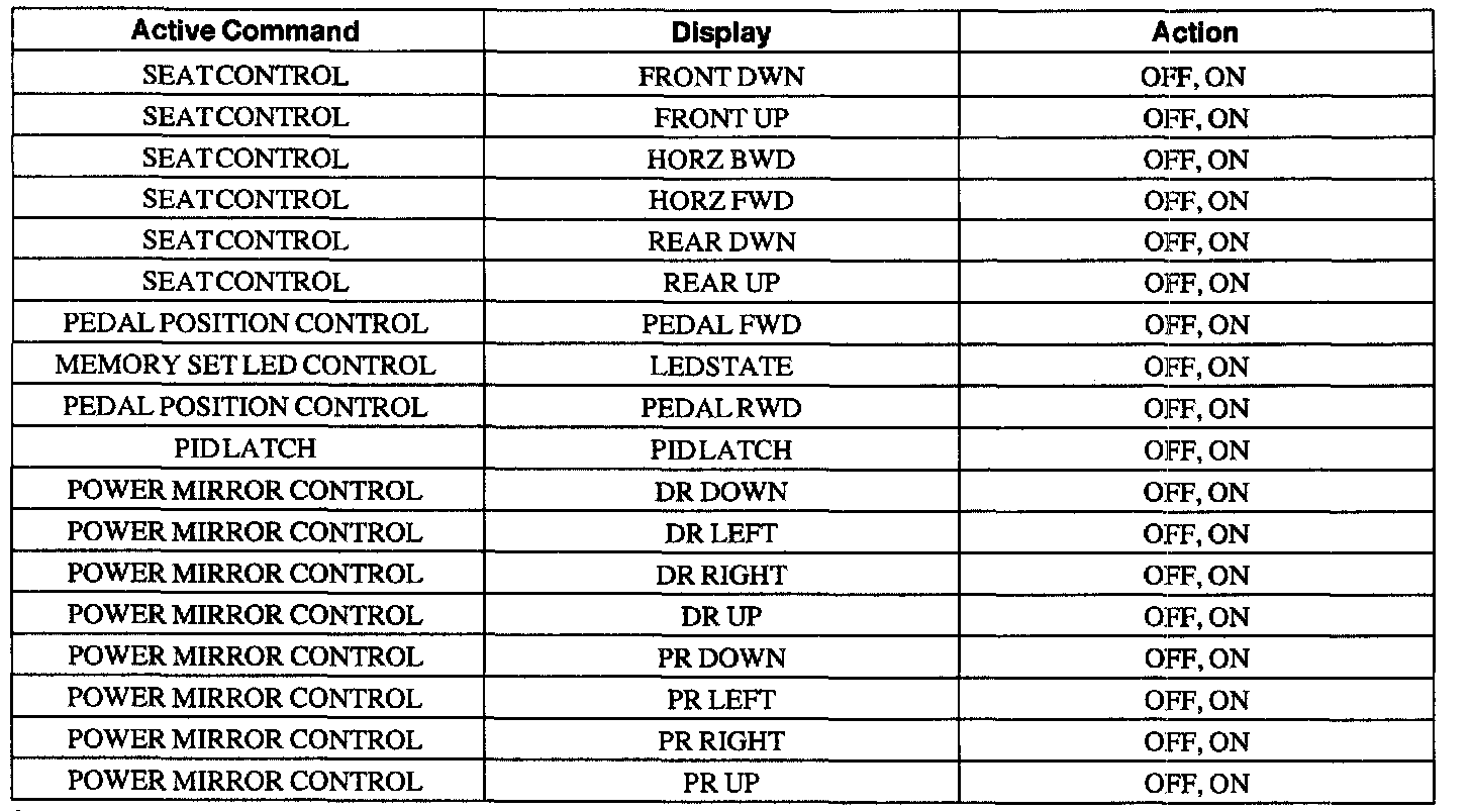 Driver Seat Module (DSM) Active Command Index