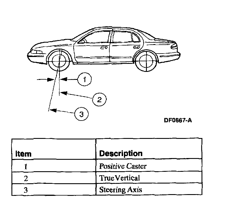 Caster is the deviation from vertical of an imaginary line drawn through the ball joints when viewed from the side. The caster specifications in this section will give the vehicle the best directional stability characteristics when loaded and driven. The caster setting is not related to tire wear.