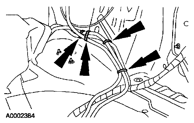 10. Remove the retaining tie straps and detach the cable forward past the rear seatback into the passenger compartment.