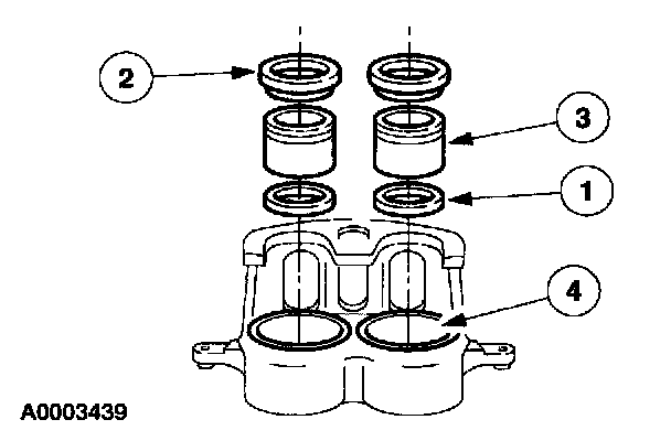 Lubricate the caliper piston, piston seal and caliper bores with clean High Performance DOT 4 Brake Fluid or equivalent DOT 4 fluid meeting Ford specification SAE-J1704-DOT 4. If DOT 4 is not available use DOT 3 Brake Fluid (United States only) C6AZ-19542-AB meeting Ford specification ESA-M6C25-A.