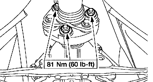 24. CAUTION: Install the bolts, washers and nuts in their original positions or driveshaft imbalance can occur. Install the driveshaft flex coupling bolts with the head of the bolt seated against the flange, and the nuts seated against the flex coupling. Install the short bolts in the front and the long bolts in the rear.