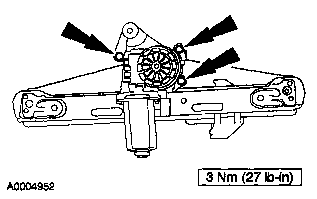 2. Remove the screws and the motor from the rear door window regulator.