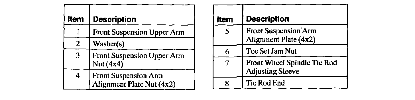 Caster and camber are adjusted by means of eccentric cams on the upper control arm mounting bolts. Toe is adjusted by the use of the front wheel spindle tie rod adjusting sleeve.